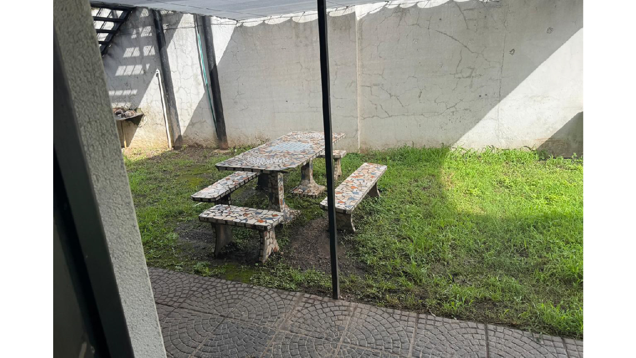 Se comparte un pequeño patio con muebles de jardín y parrilla.