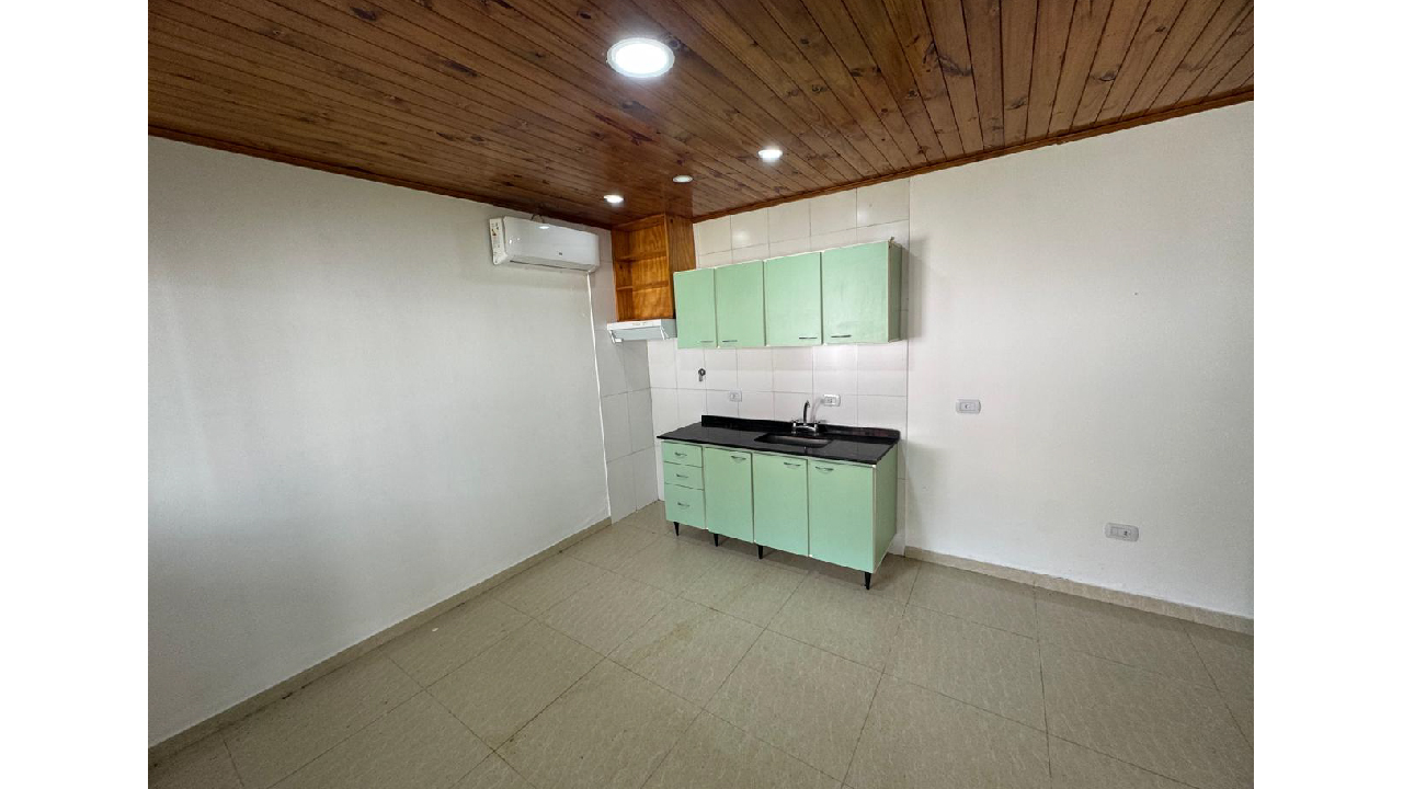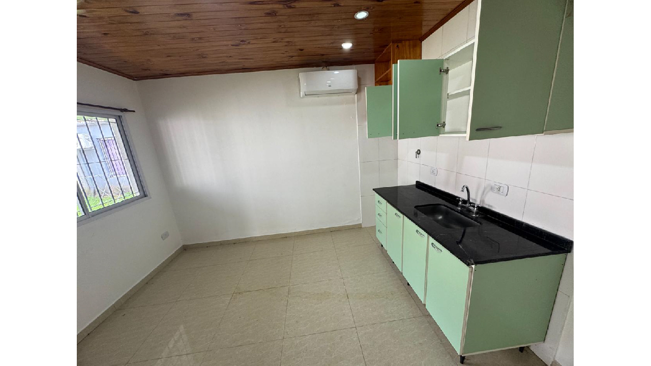 Cocina-comedor con mesada, bajo mesada y alacenas, extractor y split frio-calor.